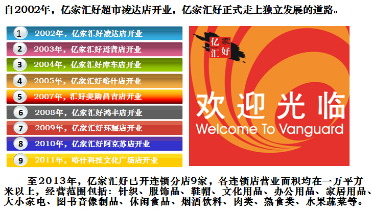 億家匯好商貿(mào)有限責(zé)任公司于2002年成立,并從臺灣引進(jìn)連鎖經(jīng)營職業(yè)管理團(tuán)隊,統(tǒng)一管理旗下各地的連鎖超市。公司通過多年的穩(wěn)健發(fā)展,至2013年底,億家匯好商貿(mào)有限責(zé)任公司已成為擁有員工近3000多人,下轄一個配送中心和9家連鎖超市的大型綜合性零售企業(yè)。總經(jīng)營面積11萬多平方米,配送中心輻射公司所有超市,年配送額可達(dá)2億元。公司大量吸納下崗職工,經(jīng)過崗前培訓(xùn),提高勞動技能,實(shí)現(xiàn)了他們的再就業(yè),為維護(hù)社會和諧穩(wěn)定做出了貢獻(xiàn)。2013年,巴州億家匯好商貿(mào)有限責(zé)任公司在自治區(qū)零售業(yè)中穩(wěn)踞前三位,是自治區(qū)重要的流通龍頭企業(yè),2013年年銷售收入達(dá)10億人民幣。多年來,公司一直重管理、抓實(shí)效、運(yùn)用先進(jìn)的管理手段和營銷理念,秉承億家匯好人 時時尋求效率創(chuàng)新,事事講究專業(yè)技術(shù)的文化精髓,創(chuàng)造了良好的經(jīng)濟(jì)效益和社會效益。公司先后多次被消費(fèi)者協(xié)會評為誠信單位,并多年被評為重合同,守信用單位。